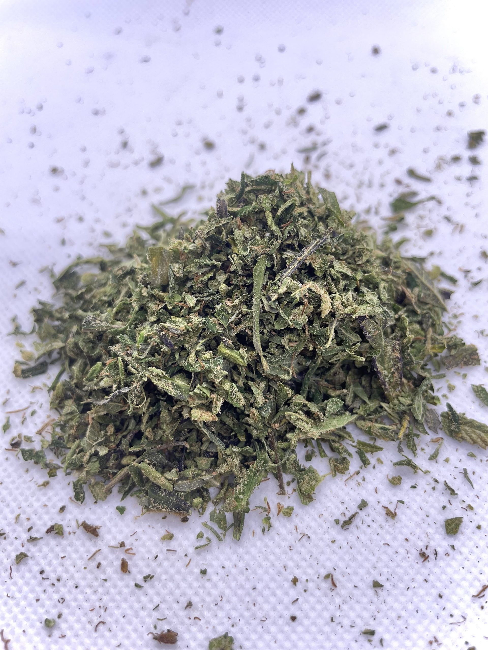 Le mot ‘TRIM’ signifie « pruning » en anglais. En français nous l’utilisons pour nommer tout ce matériel qui tombe de la fleur de chanvre lorsqu’elle est manucurée ou nettoyée avec des ciseaux après séchage.